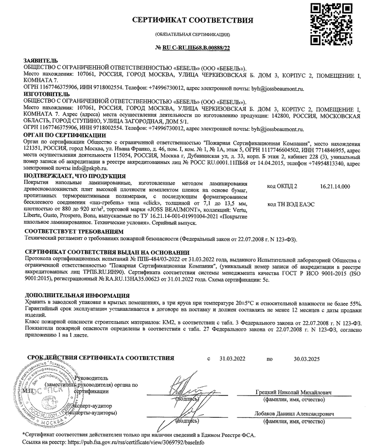 Сертификаты на продукцию завода ламинированных деревянных полов JOSS BEAUMONT