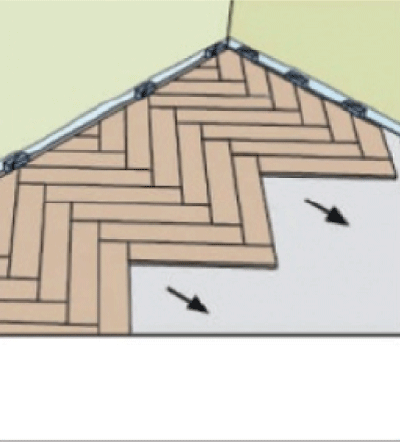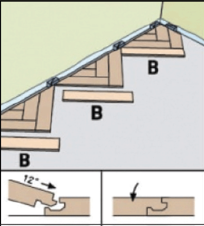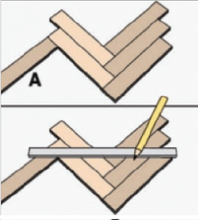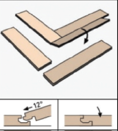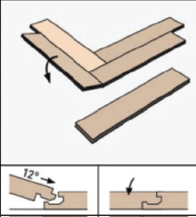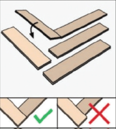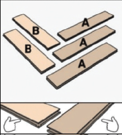 Укладку ламината необходимо начать от центра стены. Берём ламель "В" в левую руку пазом к себе. Ламель "А" вставляем шипом в паз ламели "В", пазом к себе (рис. 2.2). Образовавшийся внешний угол выравниваем по центру помещения. Чередуем ламели "А" и "В", соблюдая узор (рис. 2.3 - 2.4). Щелевой зазор устраняем с помощью добойника и киянки.