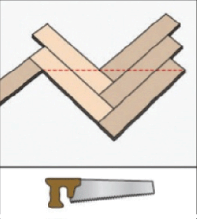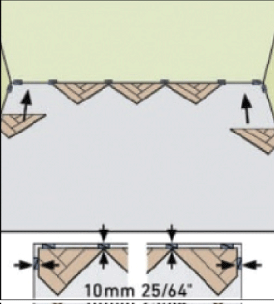 Уложить следующие 3 ряда с использованием “V” соединения панелей по всей ширине. Далее производим обрезку всех собранных ламелей параллельно стене, от которой начали сборку, чтобы они соответствовала нужному углу. Отрезанный участок будет использован в конце монтажа. Линию отреза сдвигаем к стене и выравниваем по центру помещения, выдерживая зазор 10 мм от стены, устанавливаем распорные клинья (рис. 3.1 - 3.4). Повторить укладку ламелей в 3 ряда до тех пор, пока рисунок не покроет всю ширину стены (рис.3.4).