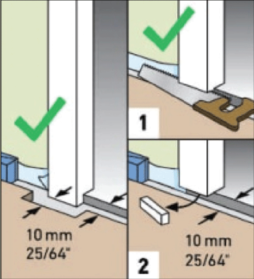 Обращаем ваше внимание, что компенсационные швы необходимо оставлять не только по периметру комнаты. Требуется оставлять зазоры между ламинатом и трубами отопления, а также между панелями ламината, уложенного в разных комнатах. Тоже самое относится и к дверным коробкам. Для соблюдения зазоров коробки устанавливаются после того, как уложено напольное покрытие. Если монтаж ламината производится при уже существующих дверных коробках, то их края необходимо подпилить. Так, чтобы они не давили на ламинат и не были жесткого крепления напольного покрытия.